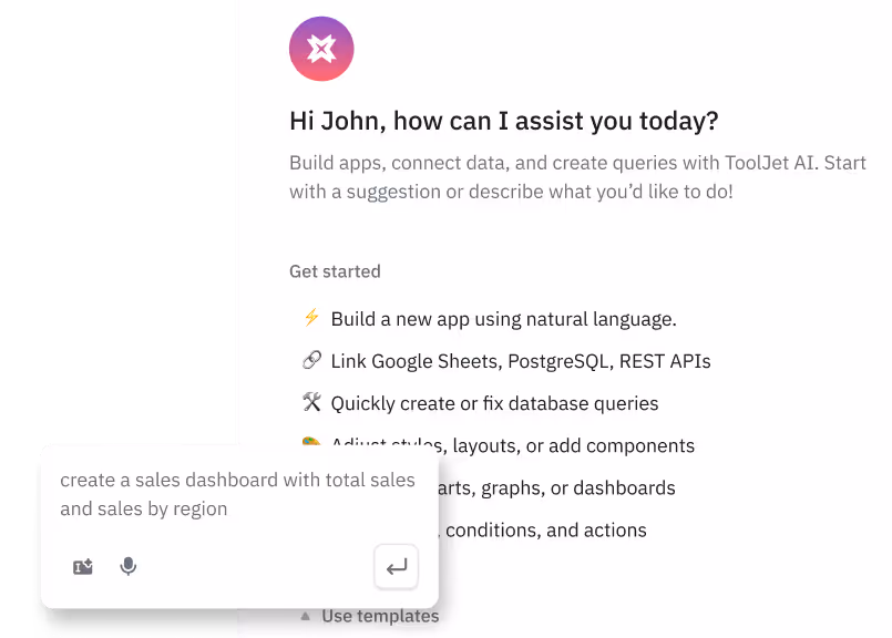 Describe your dream app – we'll build it. Generate dashboards, forms, layouts, and custom components instantly with just a single prompt.